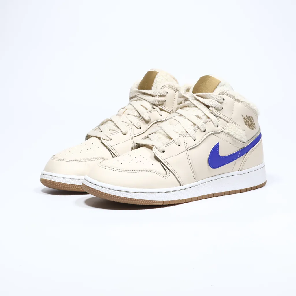 Elevate your child's sneaker game with the Air Jordan 1 Mid Utility Sneakers in a stylish beige colorway. Crafted with premium leather, these kicks offer both durability and comfort for all-day wear. The iconic Air Jordan silhouette is updated with a mid-top design, providing ankle support and a modern look. Perfect for active kids, the sneakers feature a cushioned midsole for impact protection and a rubber outsole for traction on various surfaces. Whether for casual wear or sports activities,