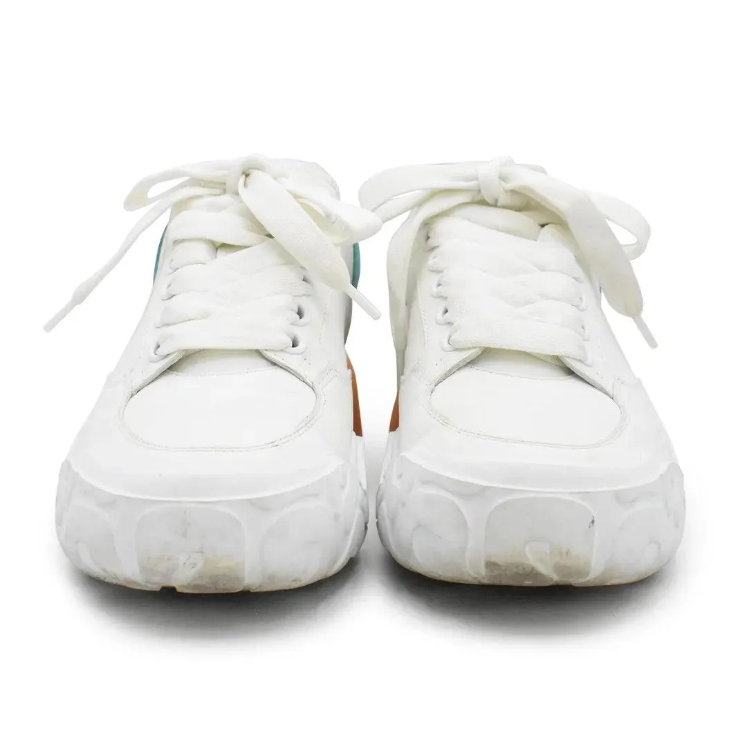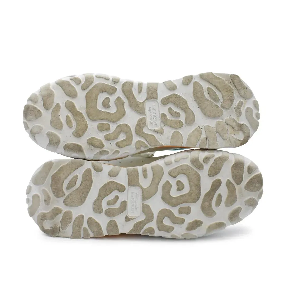 Alexander McQueen chunky sneakers in white leather with blue and grey suede panel. Features a orange and white chunky sole.