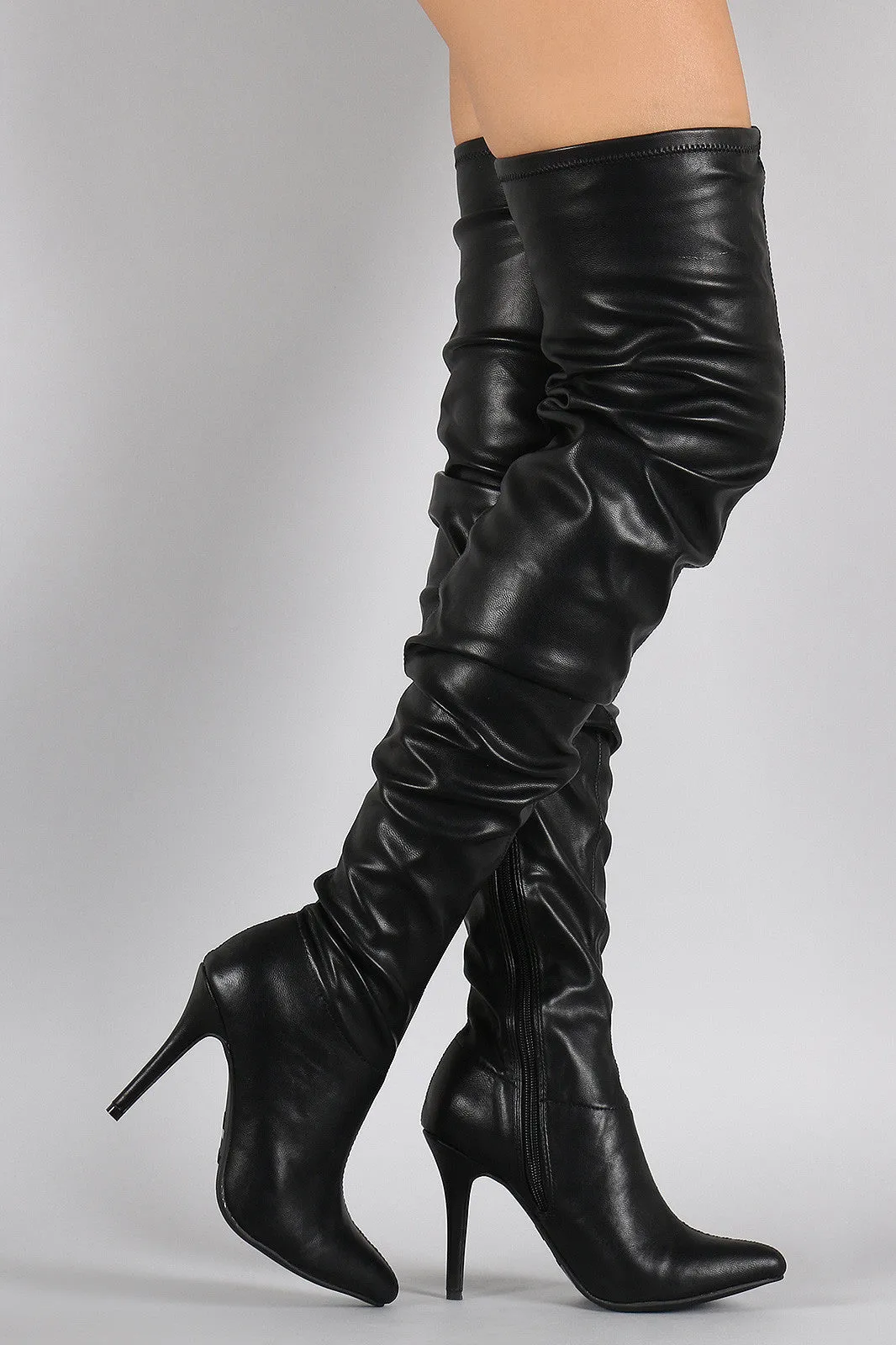 These trendy over-the-knee boots feature a pointy toe silhouette, slouchy shaft, and stiletto heel. Finished with cushioned insole, smooth interior lining, and partial side zipper closure.