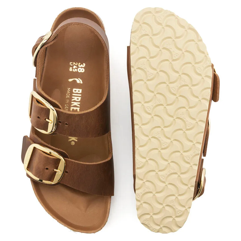 Oiled leather puts a distinctly heritage spin on the fashion favorite Milano sandal, with gleaming big buckles for a statement finish. This Semi-Exquisite style features a cork footbed lined in luxuriously smooth leather for a premium touch you'll feel as soon as you step in. An adjustable backstrap creates the perfect fit, keeping your foot securely in place over an original contoured footbed.