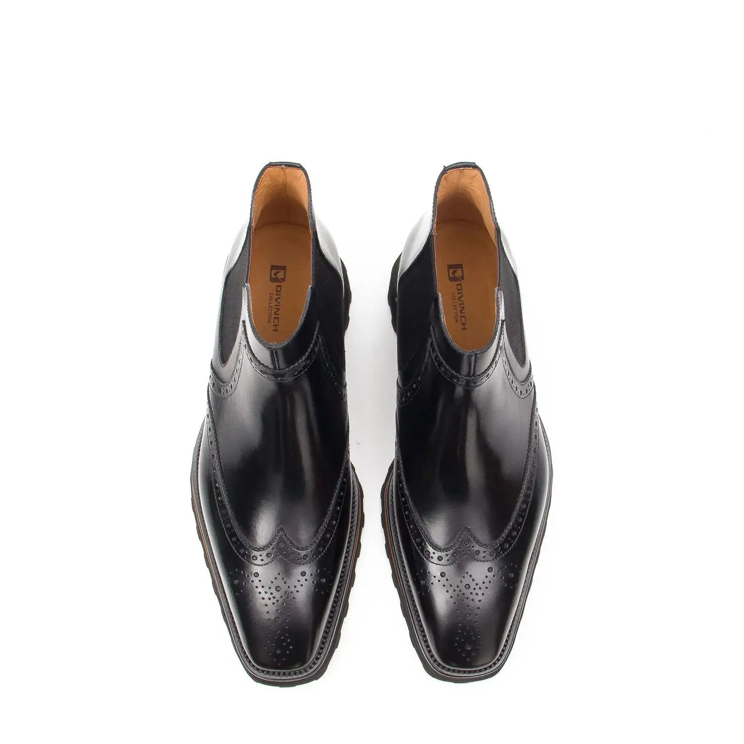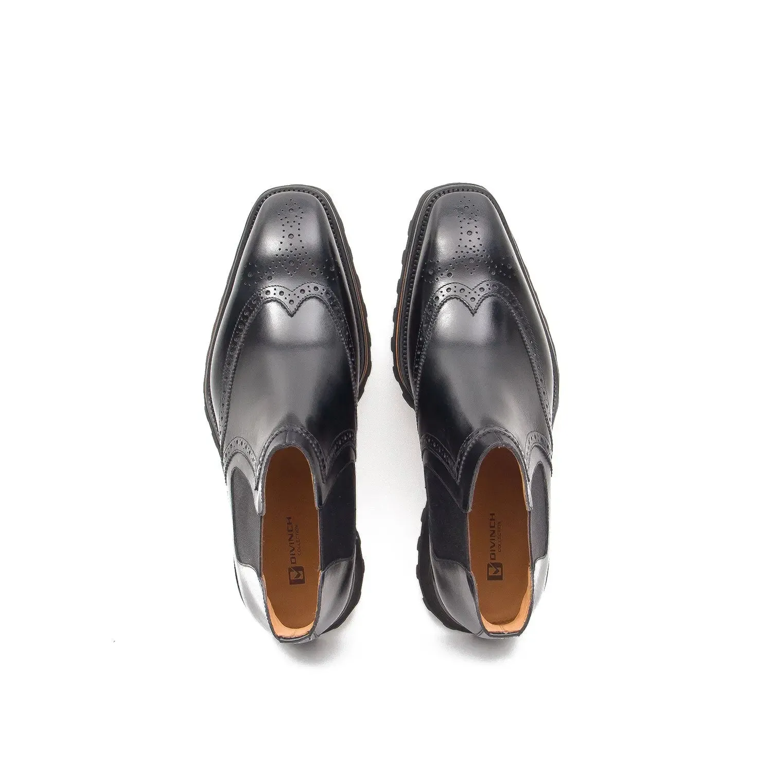This men's thick-soled brogue Chelsea boot is available in four colors: brown, black, coffee, and blue. The upper is made from premium calf leather, with a matching leather interior for exceptional comfort. The elastic slip-on design ensures easy wearing, while the 6 cm thick sole enhances durability and comfort.
