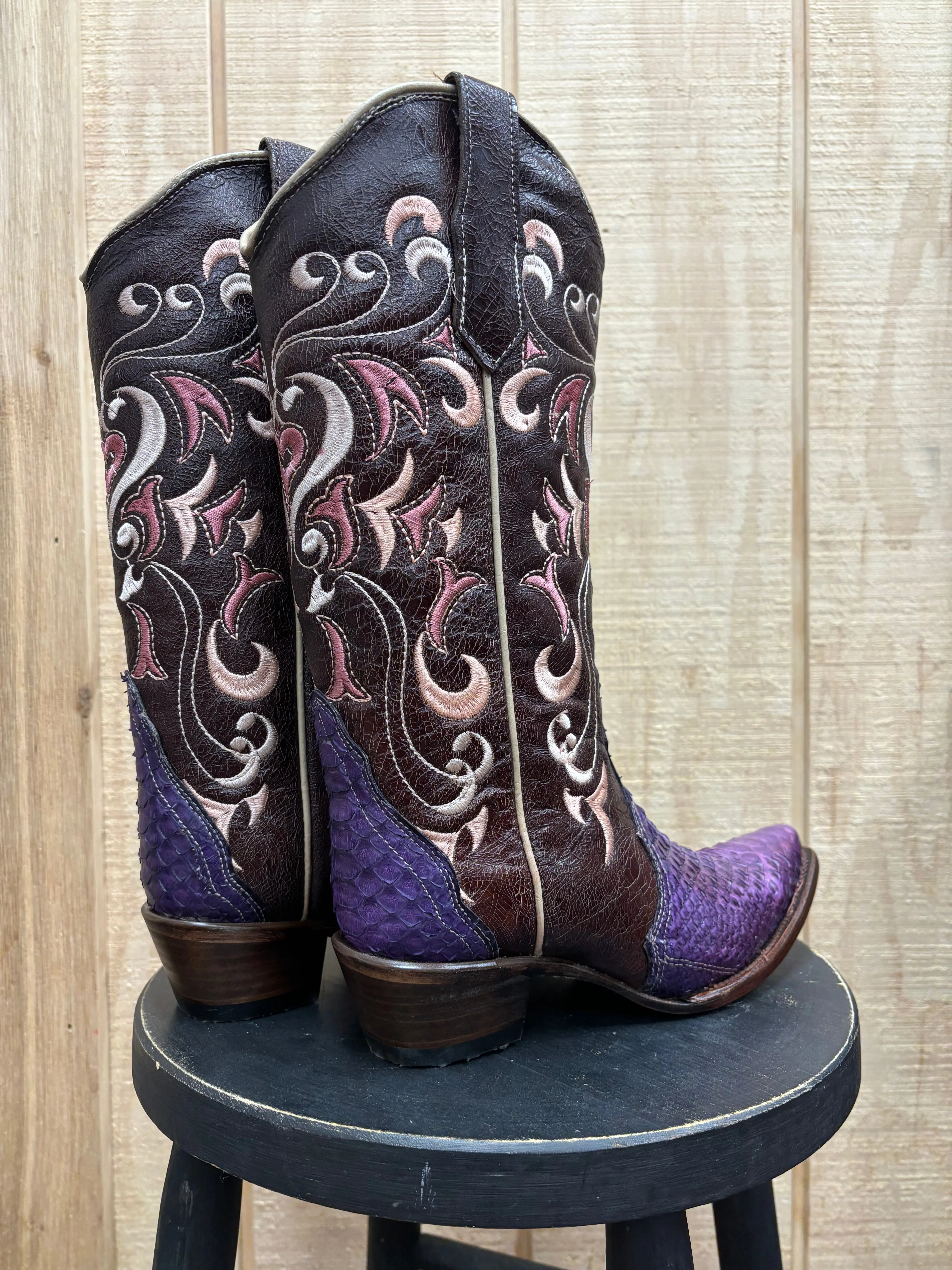 Circle G Women's Purple Embroidered Python Snip Toe Cowgirl Boots. This boot features gorgeous mauve and cream toned embroidery detail topping off the unique purple python vamp. Shaft is a compliment deep brown crackle tone.