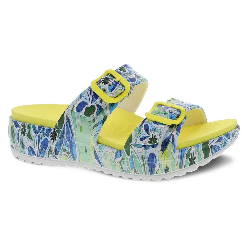 This double strap slide sandal features fully adjustable buckles and is easy to put on and take off. Uppers and footbed are made from 55% bio-based injected EVA, making it lightweight, durable, and easy to clean. A cushioned footbed is cushioned and features Dansko Natural Arch technology for added arch support, and the channeled outsole provides durability and long-lasting wear.