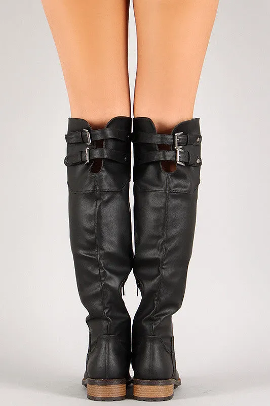 This knee high boot features a distressed vegan leather upper, round toe, adjustable buckle closures at knee cuff, and low block heel. Finished with cushioned insole and side zipper closure for easy on/off.