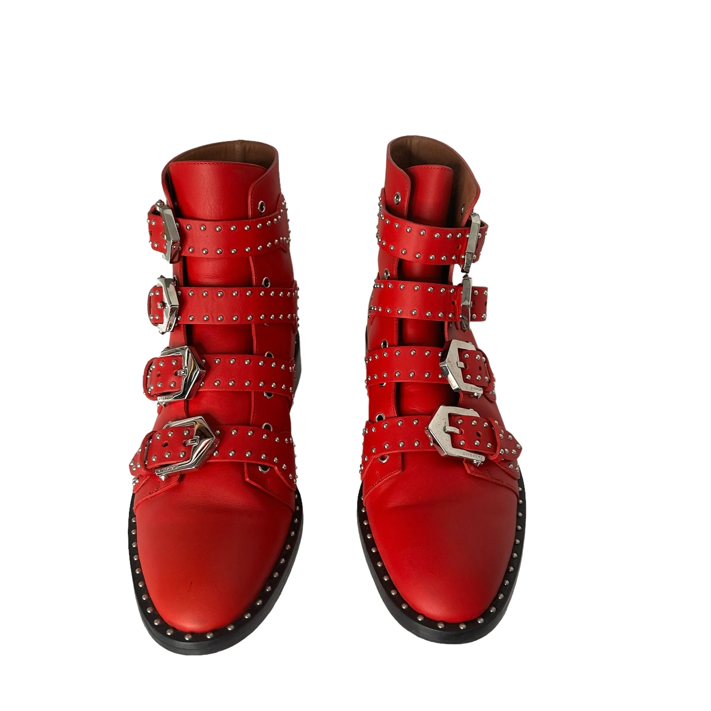 Givenchy buckled boots. Red leather with silver-tone hardware and studs. Designer size 38.