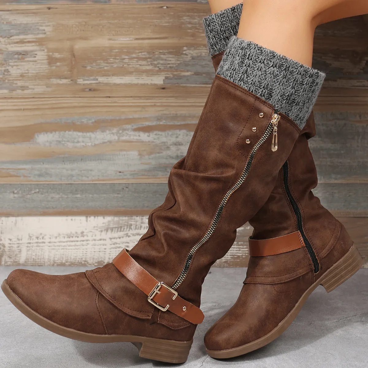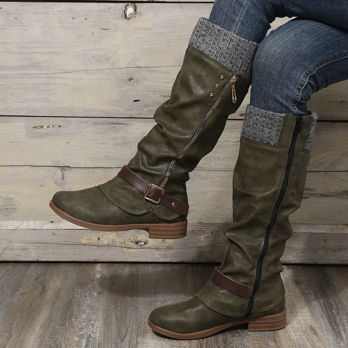 With a round toe and patchwork design. theTillbuy Knit Patchwork Knee High Boots offer a unique style. The knitted suede material gives a solid color appearance. while the zipper and buckle provide a secure fit. The thick. low square heel. made with high-quality materials like PU. rubber. microfiber. viscose. and artificial fur. offers both comfort and durability for a lasting wear. Elevate your wardrobe with these fashionable and functional high boots.