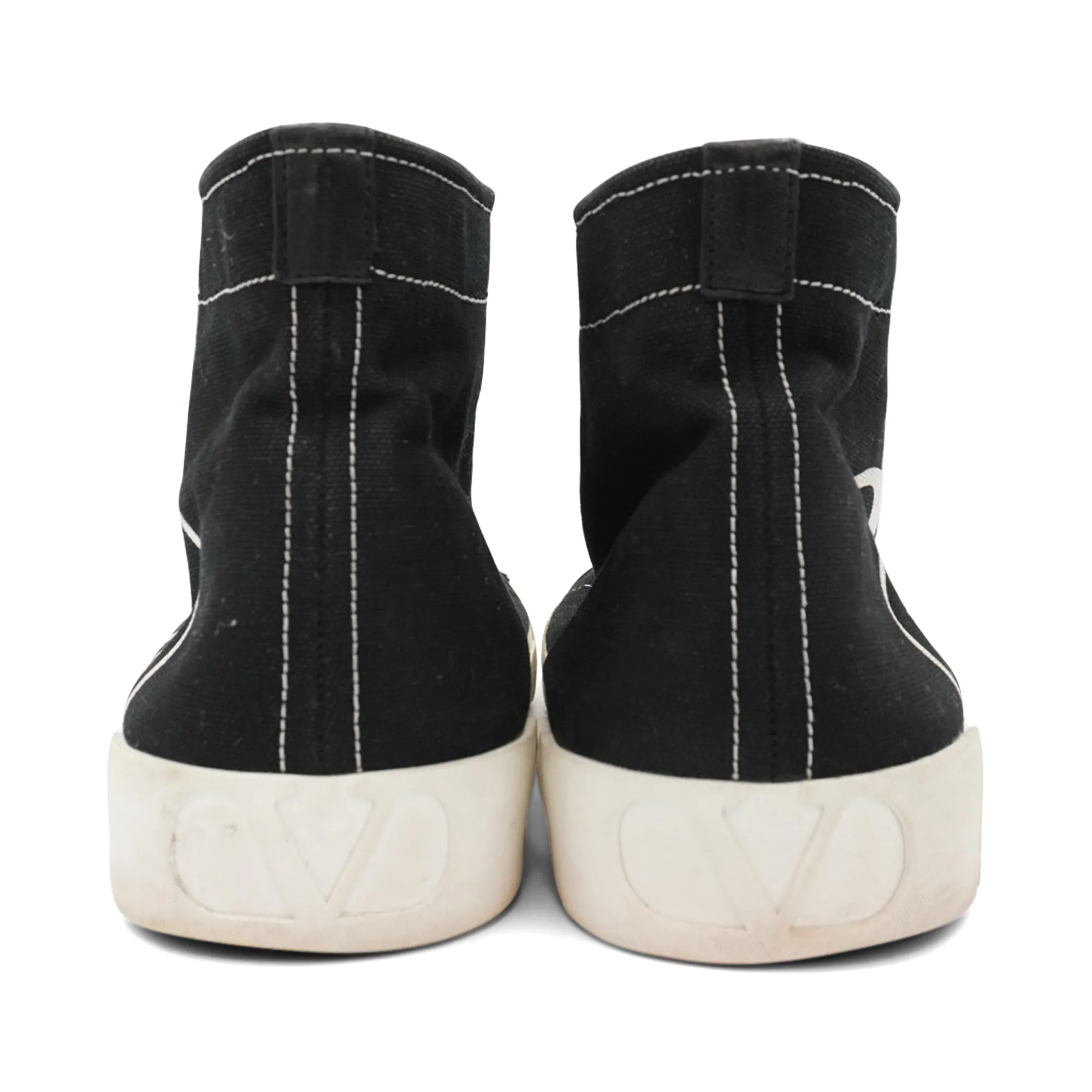 Valentino High-Top Sneakers in black canvas with white contrast stitching, V logo on the side with a chunky rubber white sole.