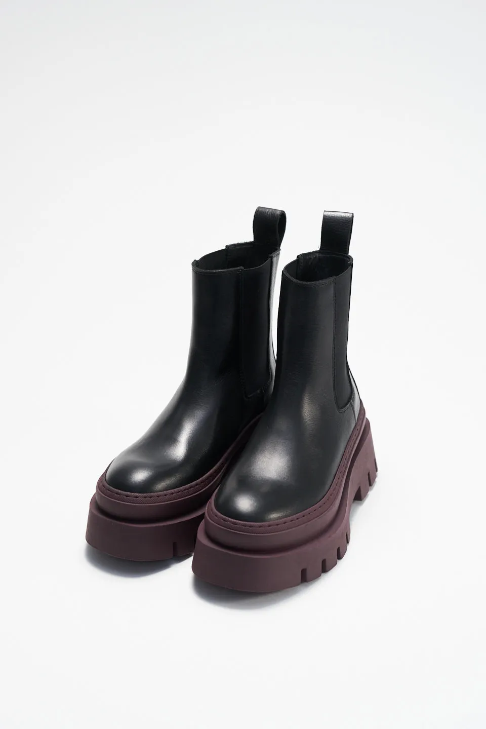 Display tough girl vibes with ‘Vitello’ chelsea boots from ‘Copenhagen Studios’ and be the slayer of trends. These ‘Black-Bordeaux’ boots feature a round toe with mudguard, leather upper with an ankle-length shaft, elastic fastening on the sides, and a chunky platform.